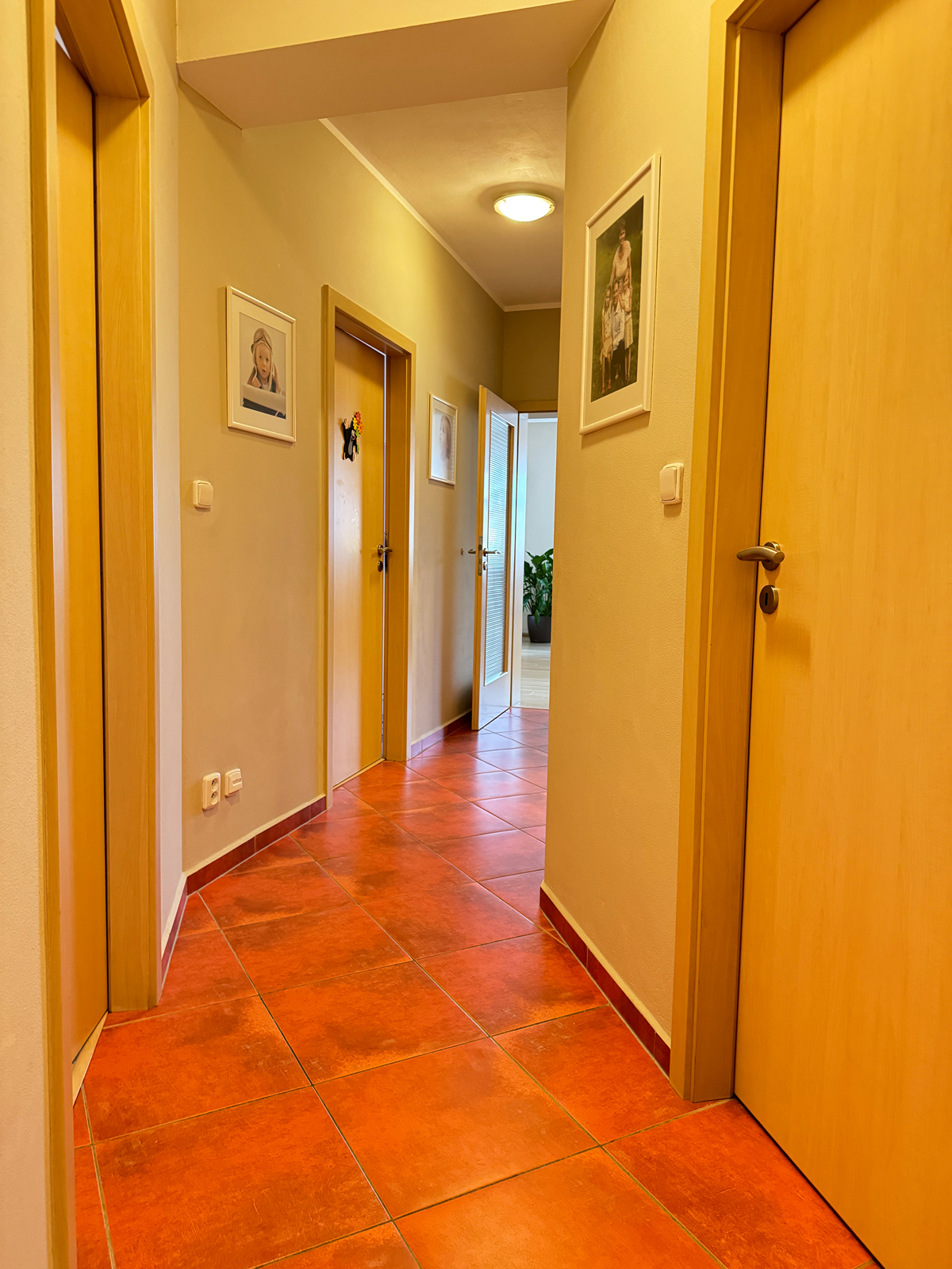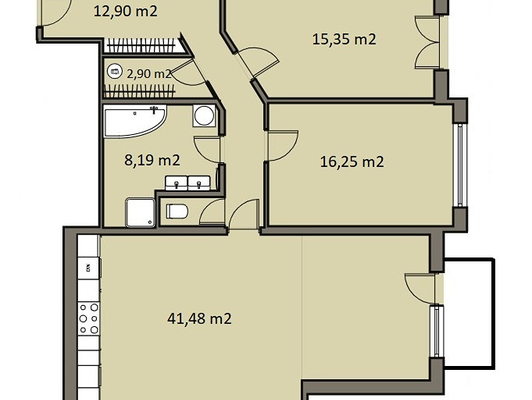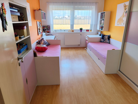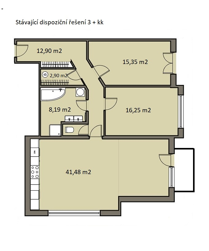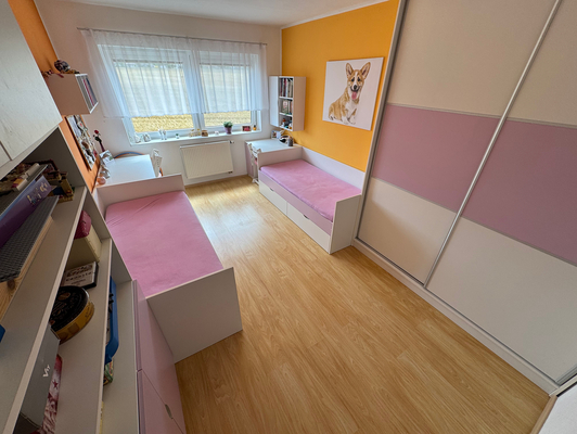 Při vstupu do bytu vás přivítá prostorná vstupní chodba 12,9 m² s úložným prostorem, která vás povede do jednotlivých pokojů. Obývací pokoj s kuchyňským koutem o velikosti 41,48 m² je srdcem tohoto domova, kde oceníte dostatek místa pro společné rodinné chvíle. Velká okna zajišťují dostatek denního světla a příjemnou atmosféru. Ložnice 16,25 m² a útulný dětský pokoj 15,35 m² poskytují soukromí a prostor pro každého člena rodiny.