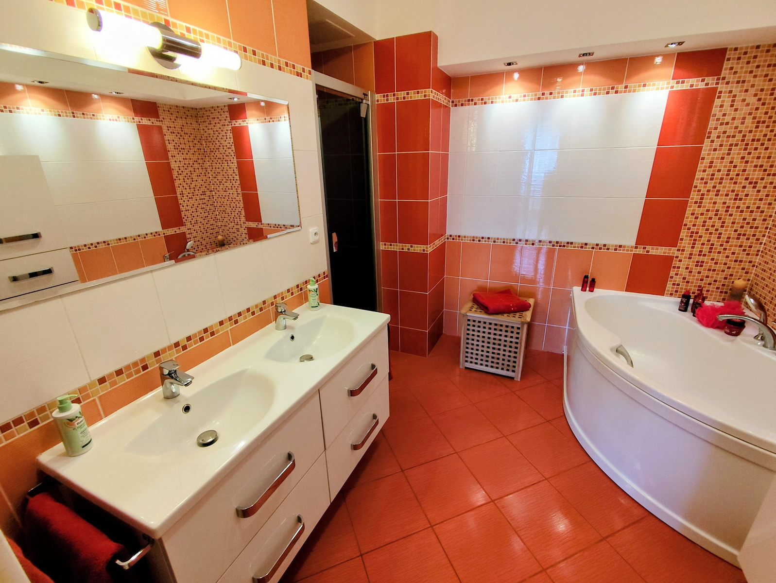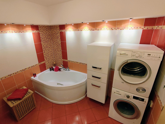 Koupelna s rohovou vanou a sprchovým koutem 8,19 m² je navržena s důrazem na komfort a praktičnost. Samostatná toaleta 1,4 m² a komora 2,9 m² přidávají bytu další funkčnost. Nechybí balkon o velikosti 4 m², který nabízí příjemné místo k relaxaci a sklep 6 m², jelikož úložného prostoru je vždy nedostatek.