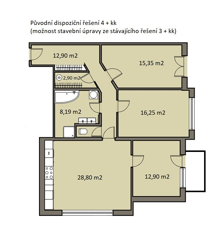 Devizou je možnost praktického přizpůsobení dispozice na původní 4 + kk. Porovnání půdorysů najdete ve fotodokumentaci.